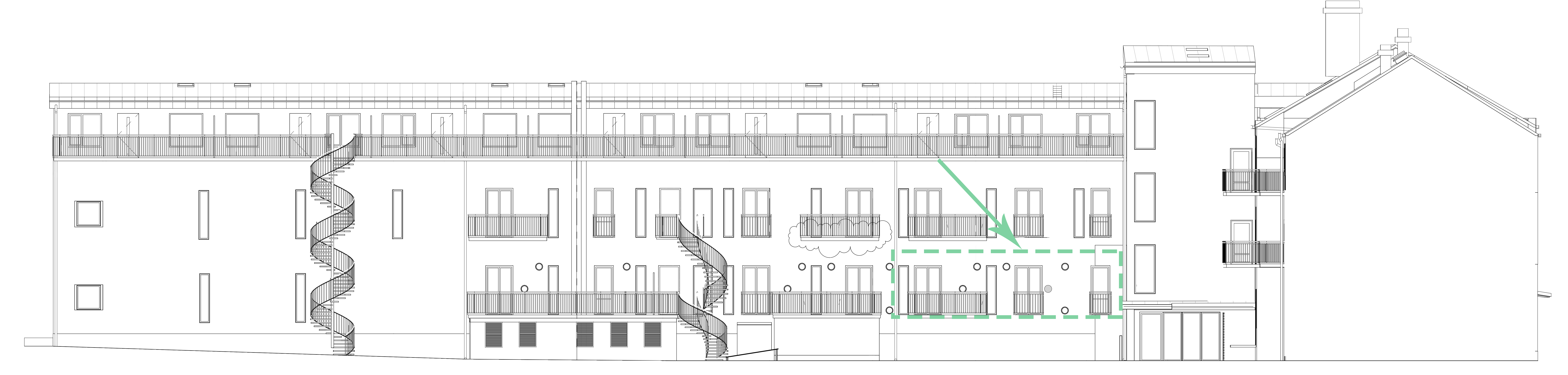 Utrustning: varmluftsugn, köksfläkt rostfritt stål, stänkpanel, kyl, frys, diskmaskin, mikrovågsugn, bänkbelysning och induktionshäll.